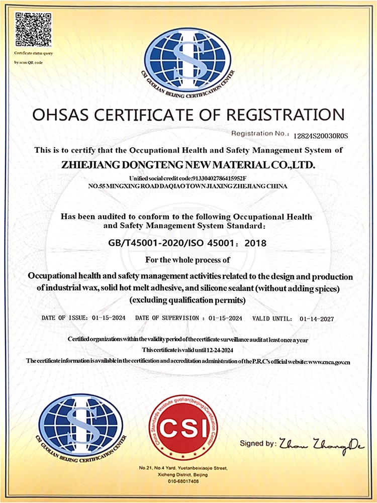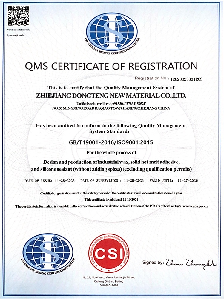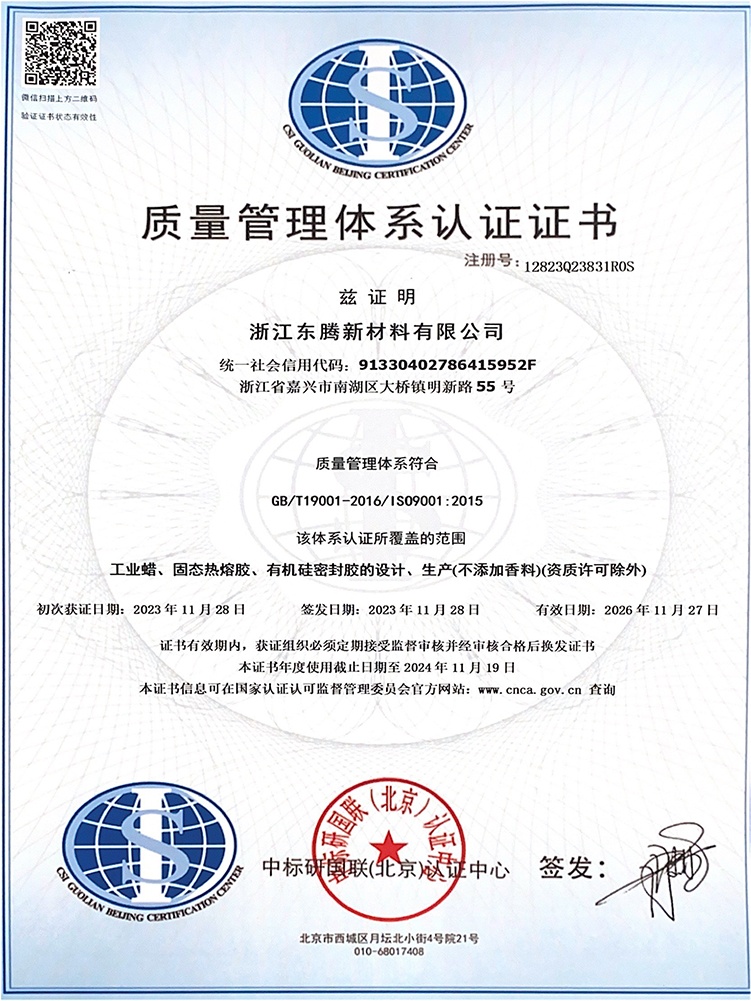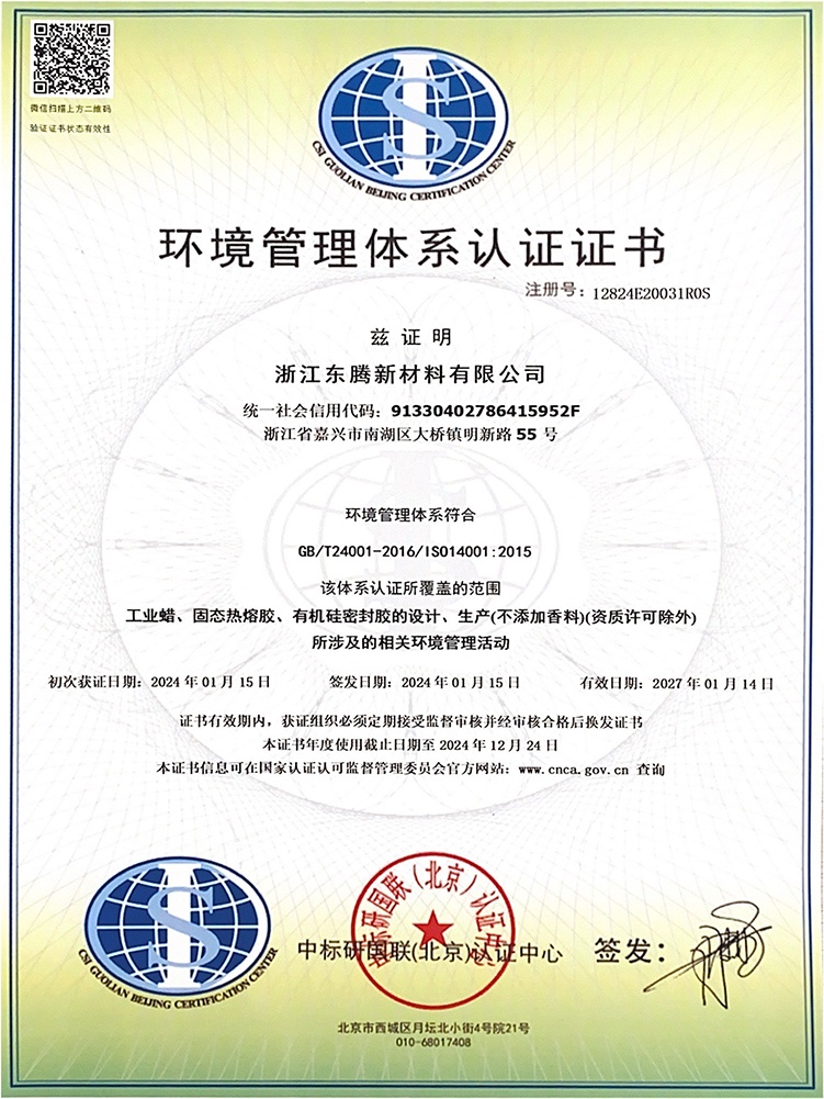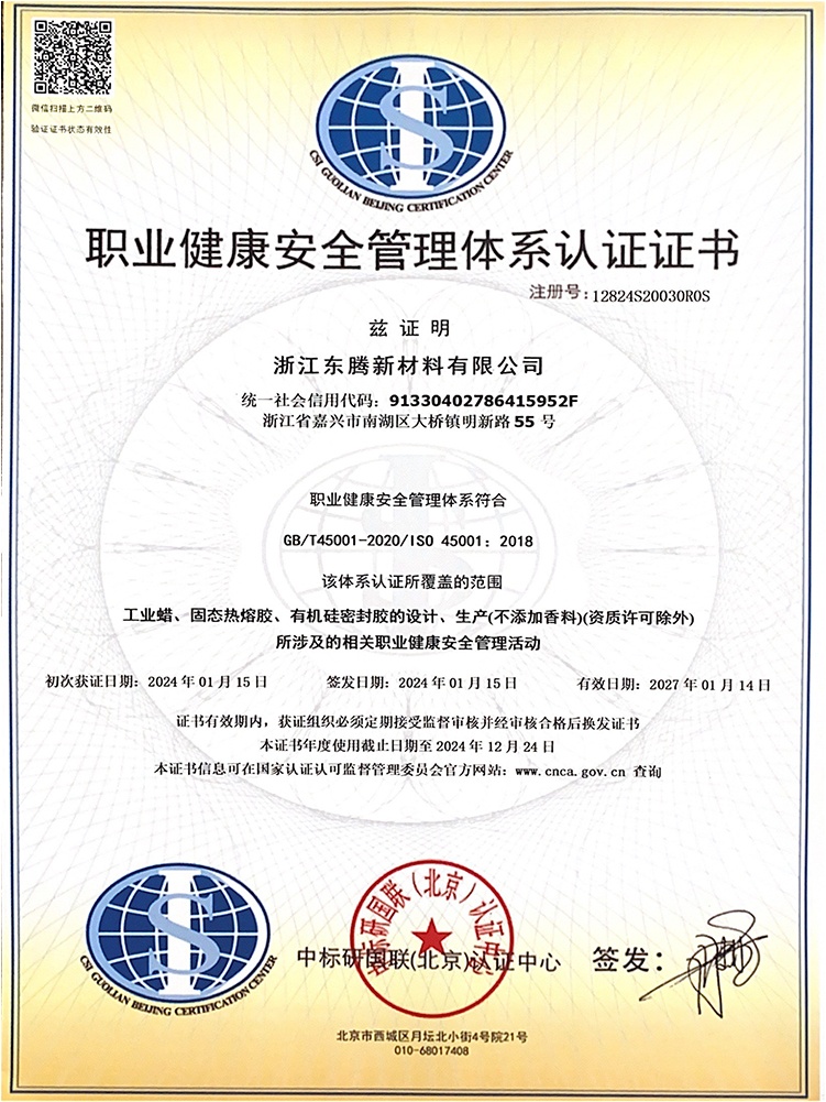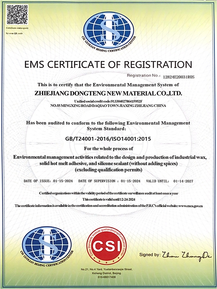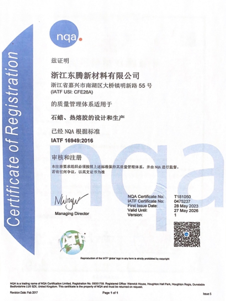 浙江東騰新材料有限公司成立于2006年,專注于特種蠟及膠粘劑的專業制造,經過歷年的行業發展,產品的精耕細作,公司現已發展成為集研發、生產、銷售綜合一體化的實力企業。公司現研發人員13人。歷年來公司持續有效的運行ISO9001、ISO14001、ISO45001、TS16949等管理體系。先后通過了浙江省科技型中小企業認定、高新技術企業認定、浙江省專精特新中小企業認定。并曾獲科技創新先進企業、嘉興市研究開發中心、浙江省守合同重信用企業等榮譽稱號。